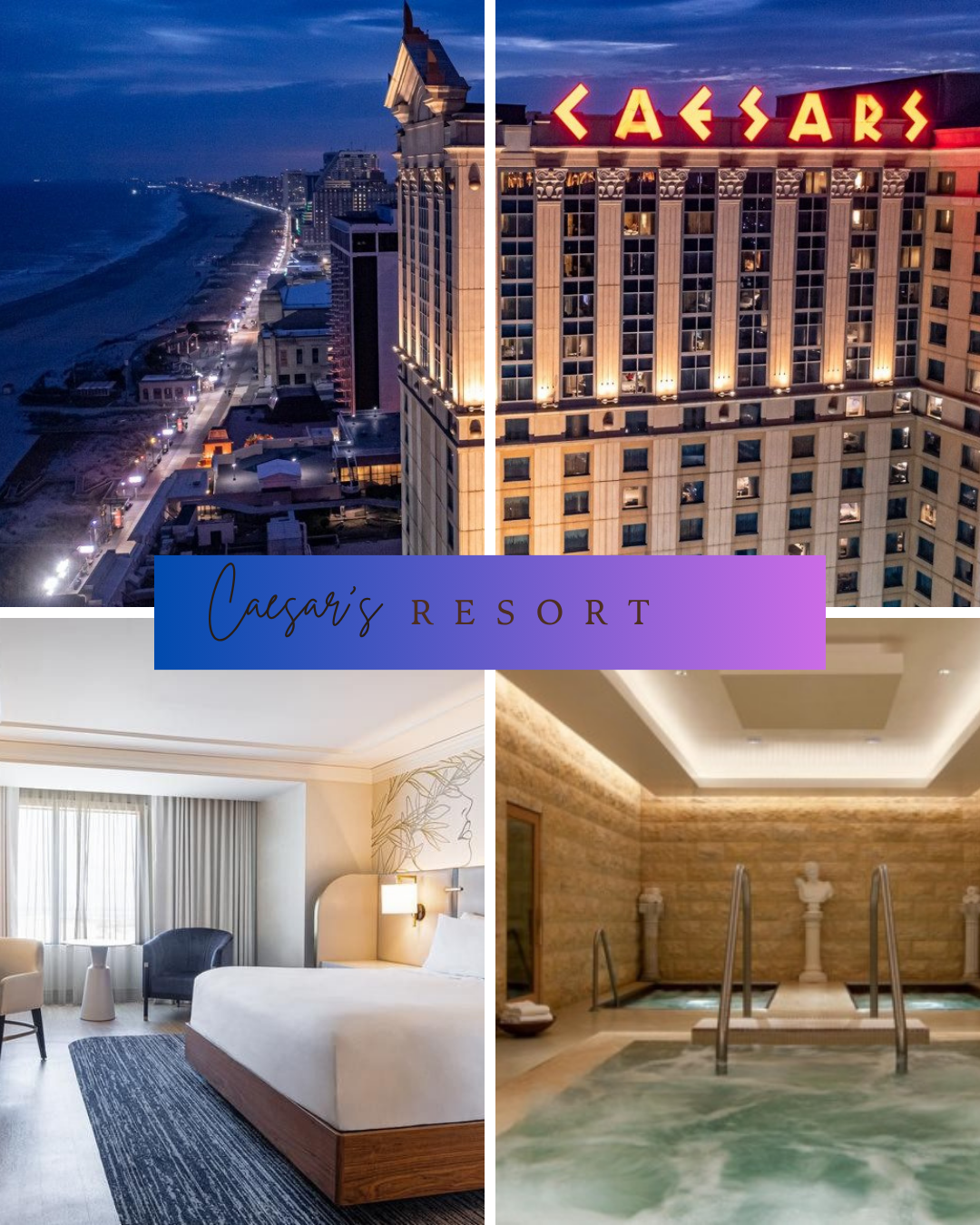 Caesar's Atlantic City is the 5 star resort on the Atlantic Ocean that provides oceanfront hotel rooms, 3 towers, pool, fitness room, spa and two Michelin chef-owned restaurants Nobu and Hell's Kitchen and a host of other steak houses and eateries. You can't go wrong with the 24 hour meal, snack, gelato, and salad availability in the lobby and the early morning opening of Starbucks. You can view all the restaurants here .